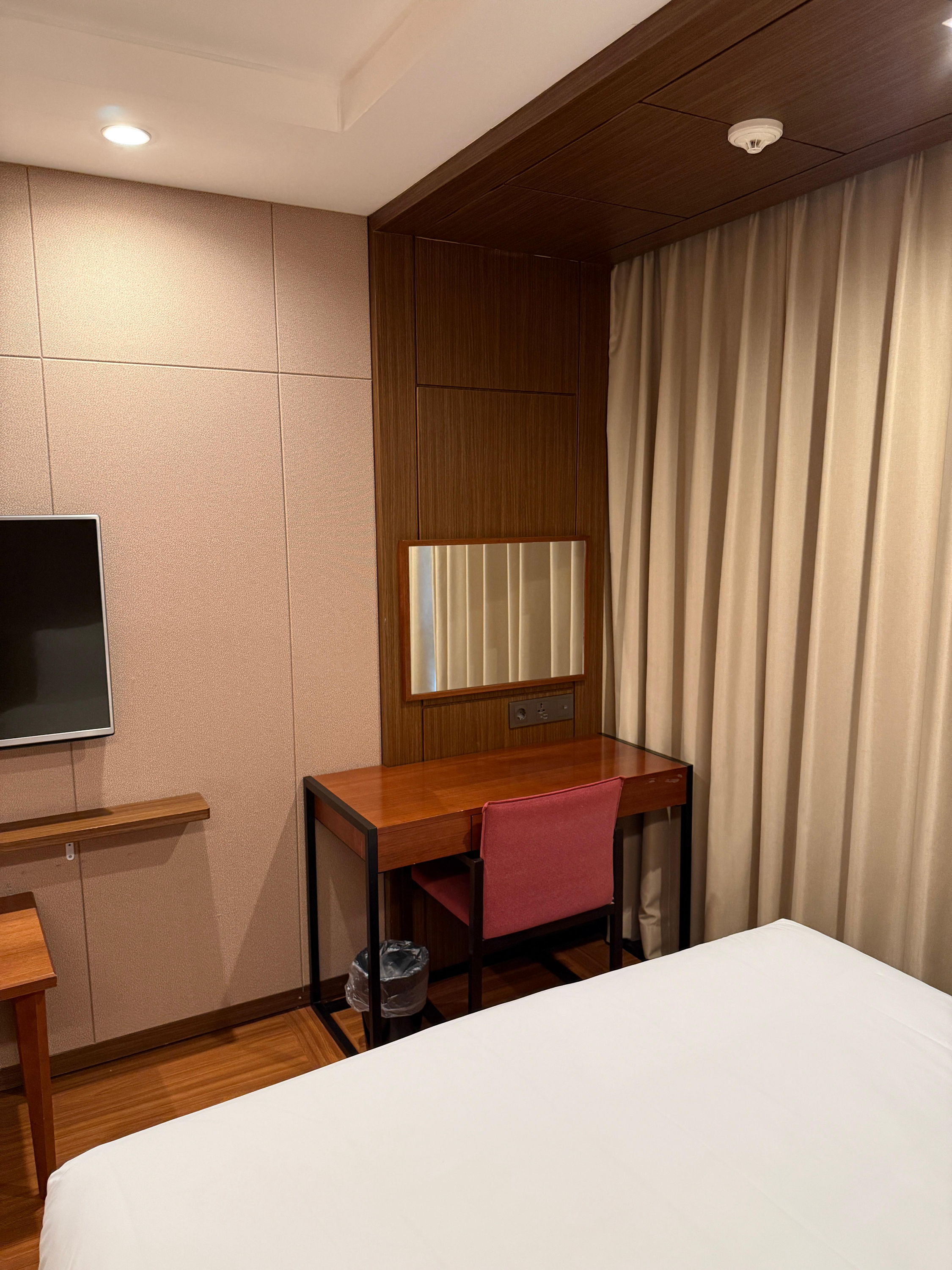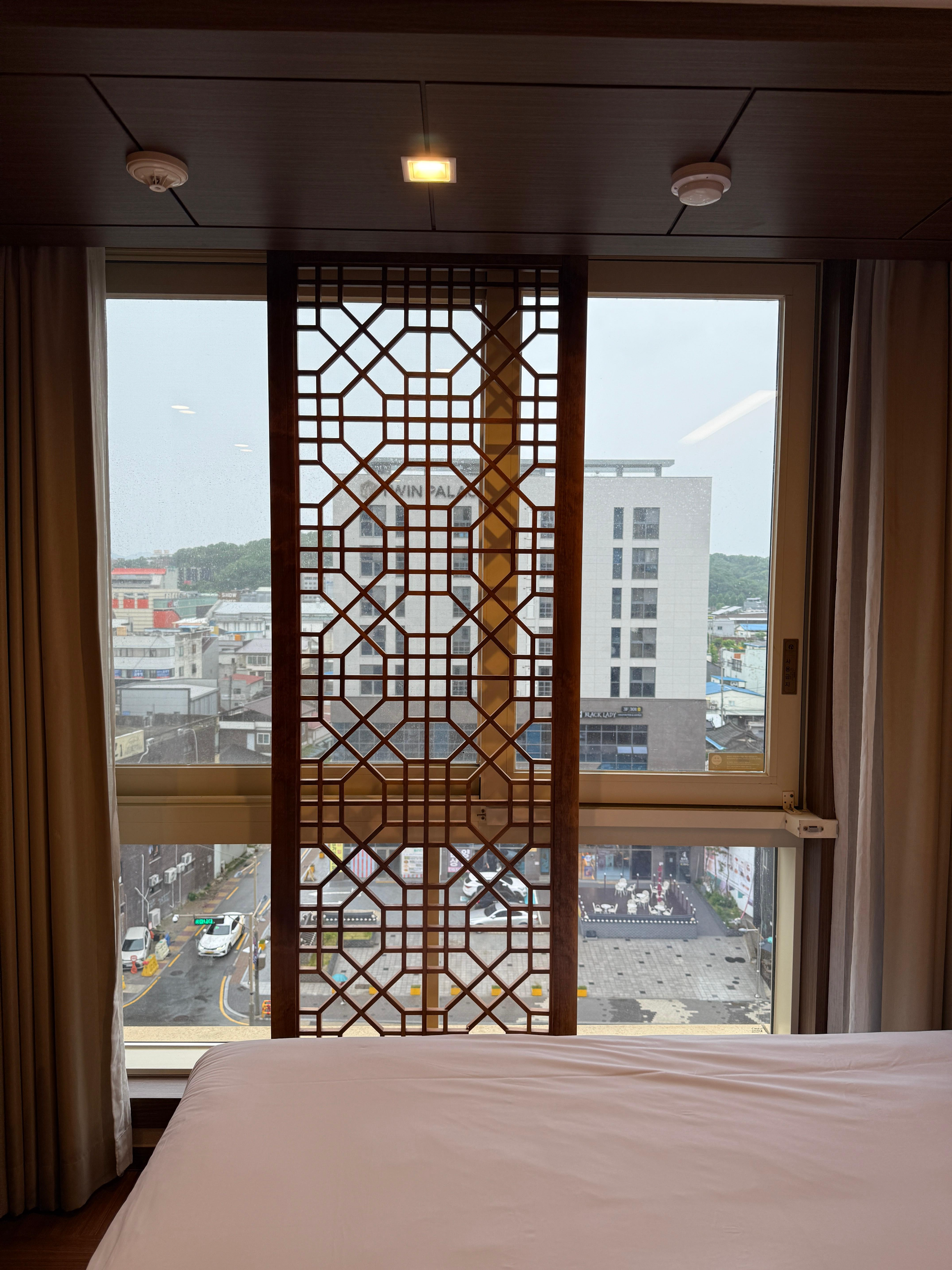 객실 내부는 청결도가 높았고, 무엇보다 침구가 포근해서 꿀잠 자기에 딱 좋았다. 침대 매트리스가 너무 푹신하거나 너무 딱딱하지 않고, 적당한 탄성이 있어서 허리에 무리도 없었다. 창문 밖으로는 전주 도심의 풍경이 펼쳐졌고, 밤에는 불빛 덕분에 조명이 따뜻한 분위기를 연출했다. 실내 조명도 밝고 깔끔해서 여행 중에도 쾌적한 느낌을 받을 수 있었다.