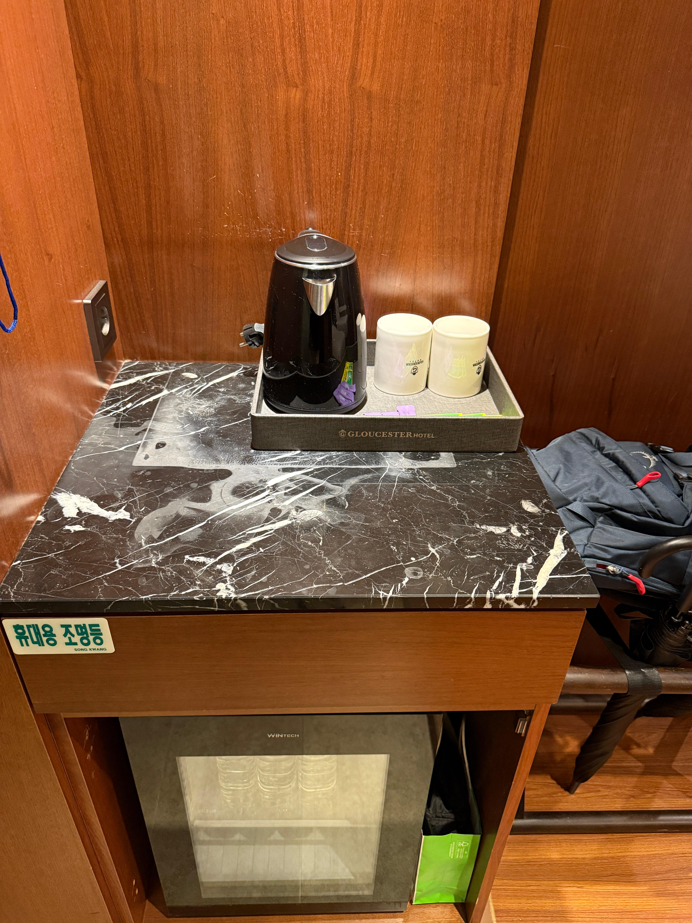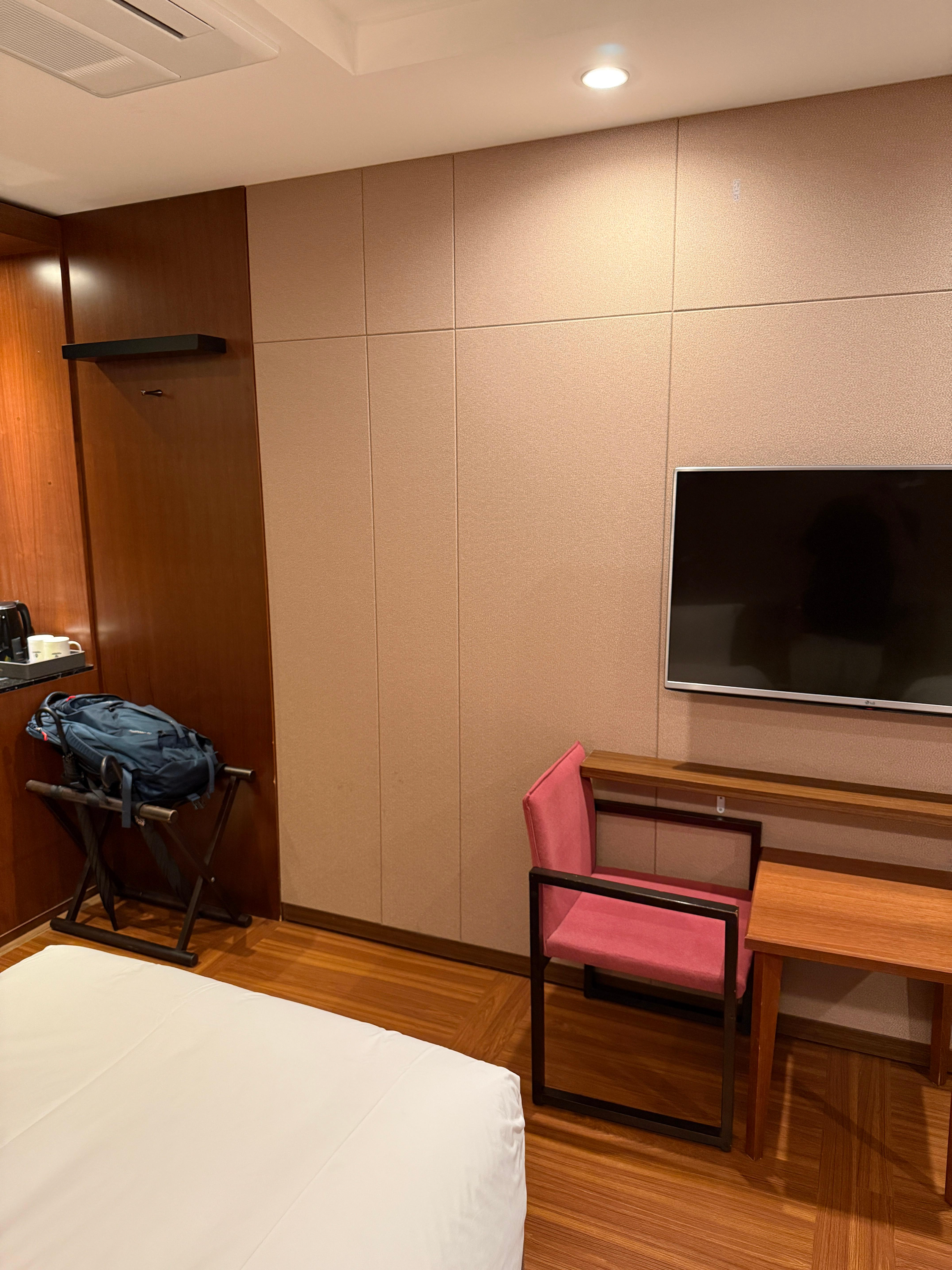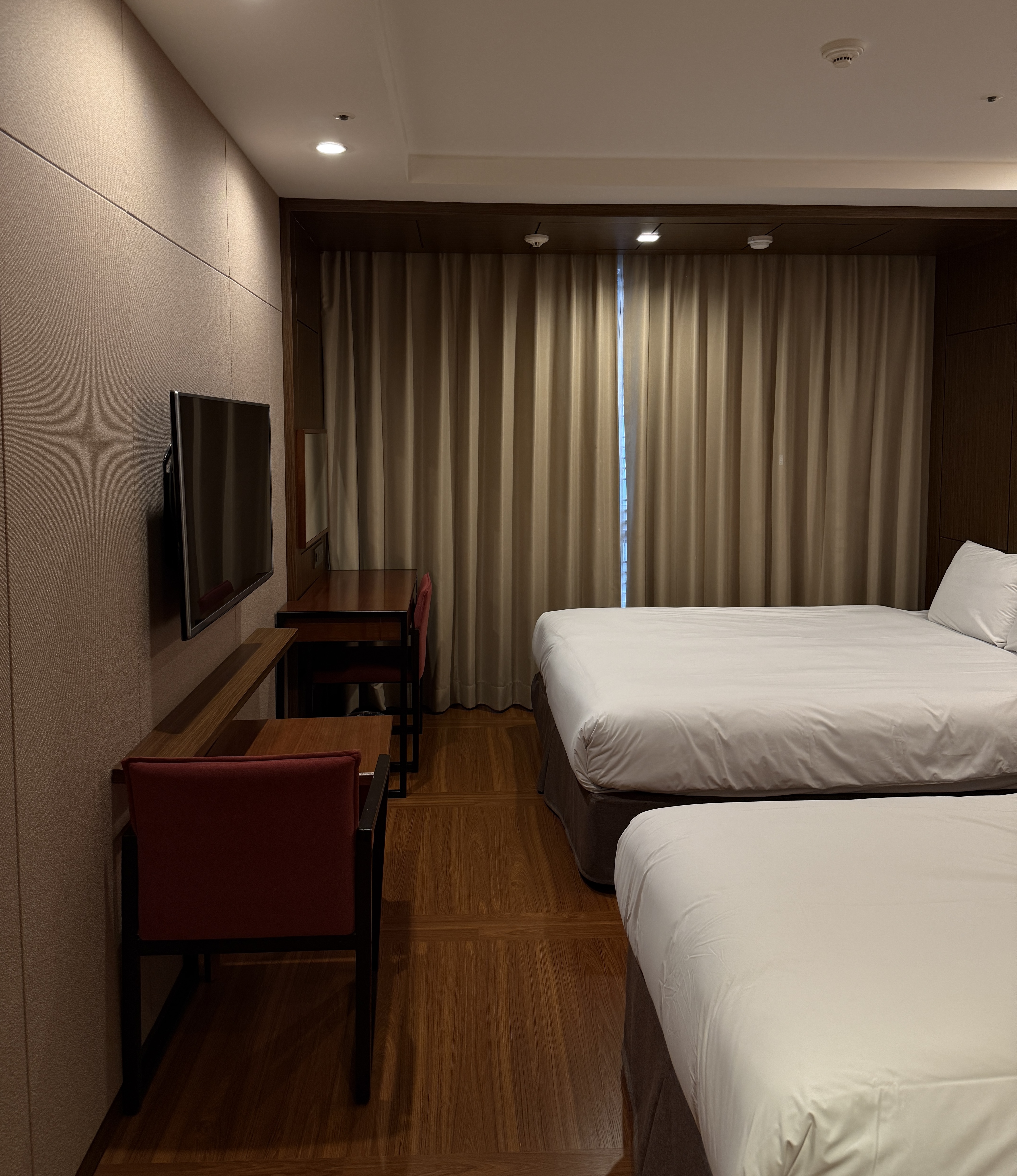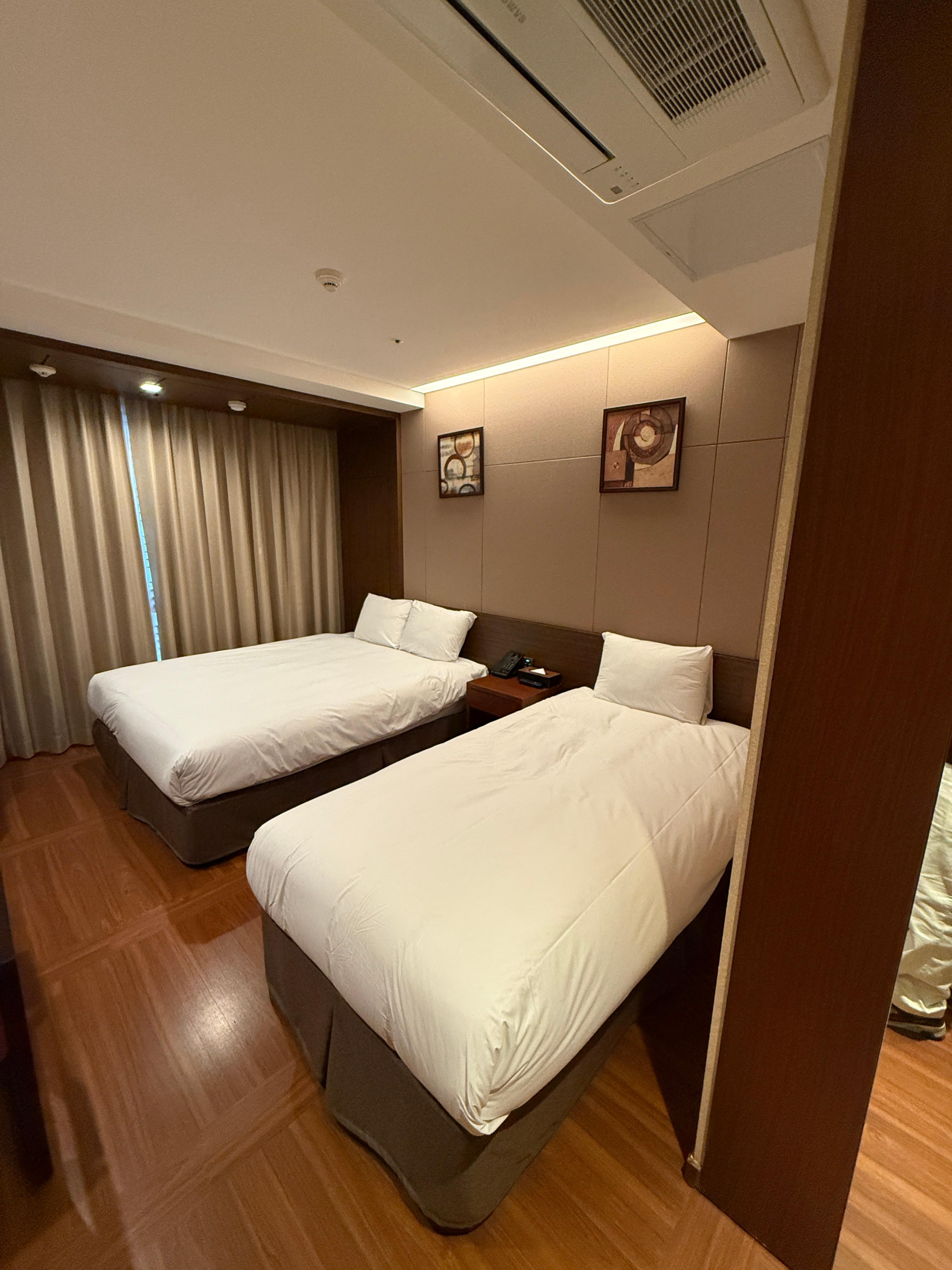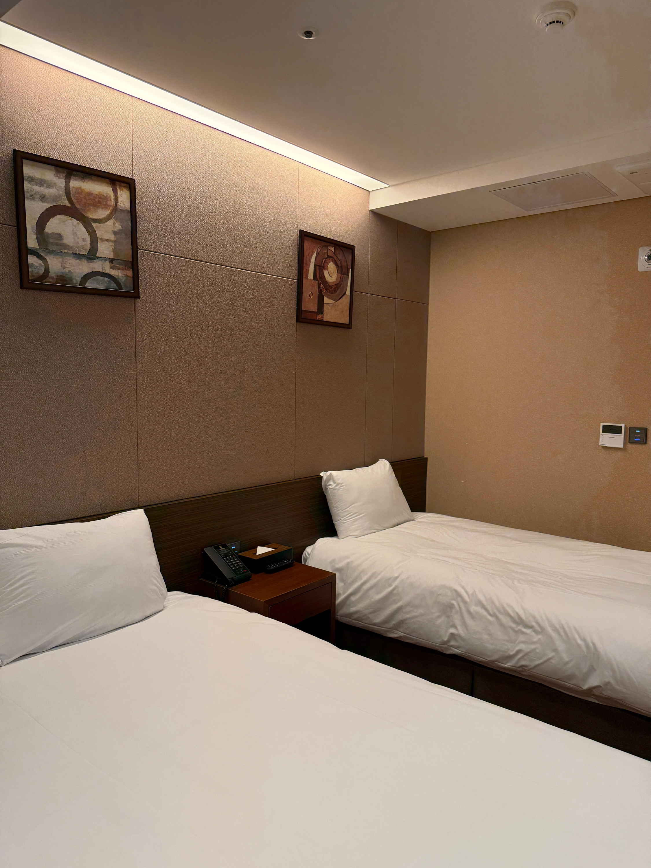 필자는 이번 전주 여행에서 예약한 건 사실 스탠다드 더블룸이었다. 그런데 운 좋게도 글로스터호텔의 특가 프로모션 덕분에 무료 업그레이드를 받아 패밀리 트윈룸에 묵을 수 있었다. 일단 방 크기부터가 넉넉했다. 더블 침대 하나, 싱글 침대 하나로 구성되어 있어서 친구와 함께 여행하더라도 공간이 충분했고, 가족 단위 투숙객에게도 딱 맞는 구성이었다.