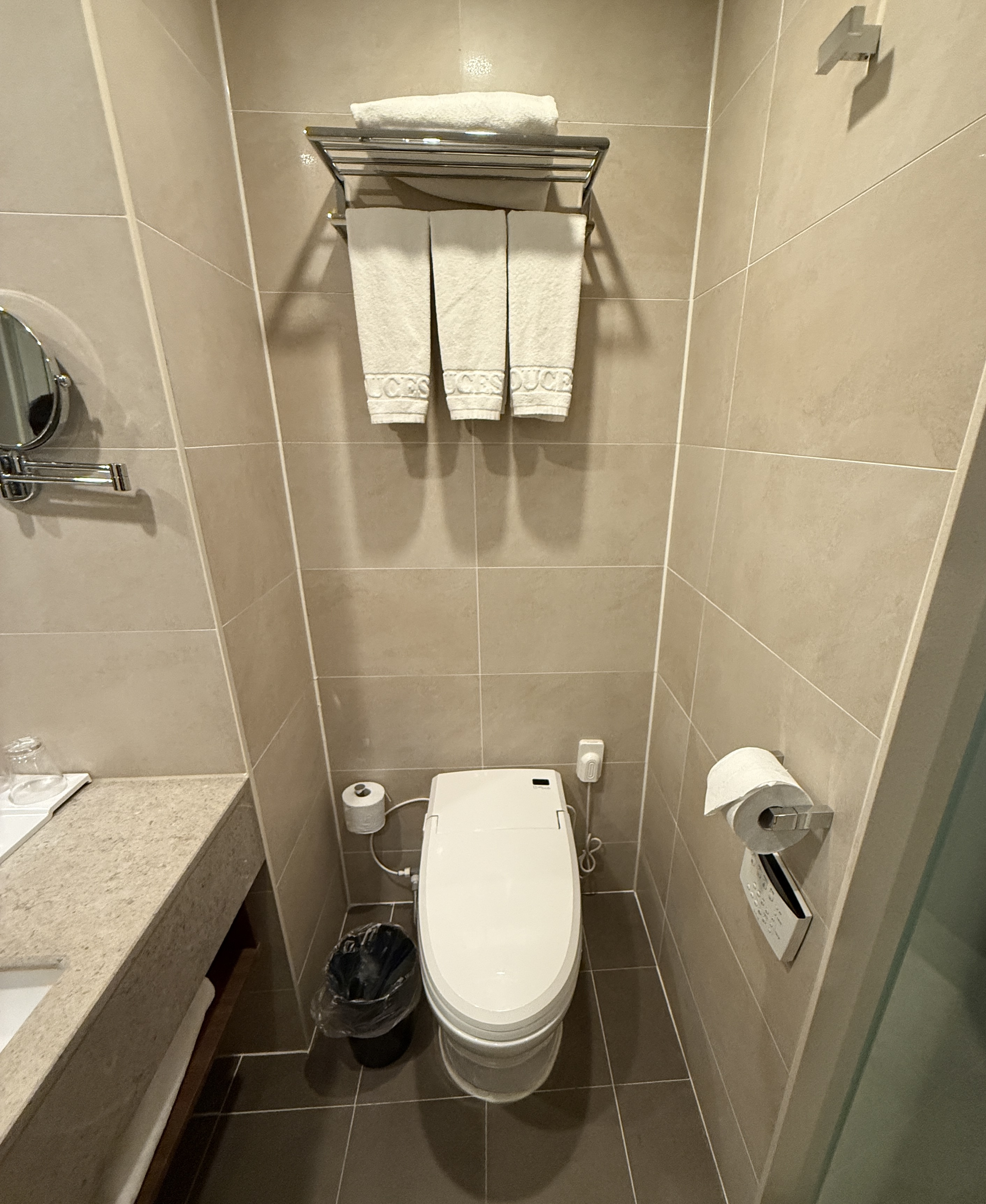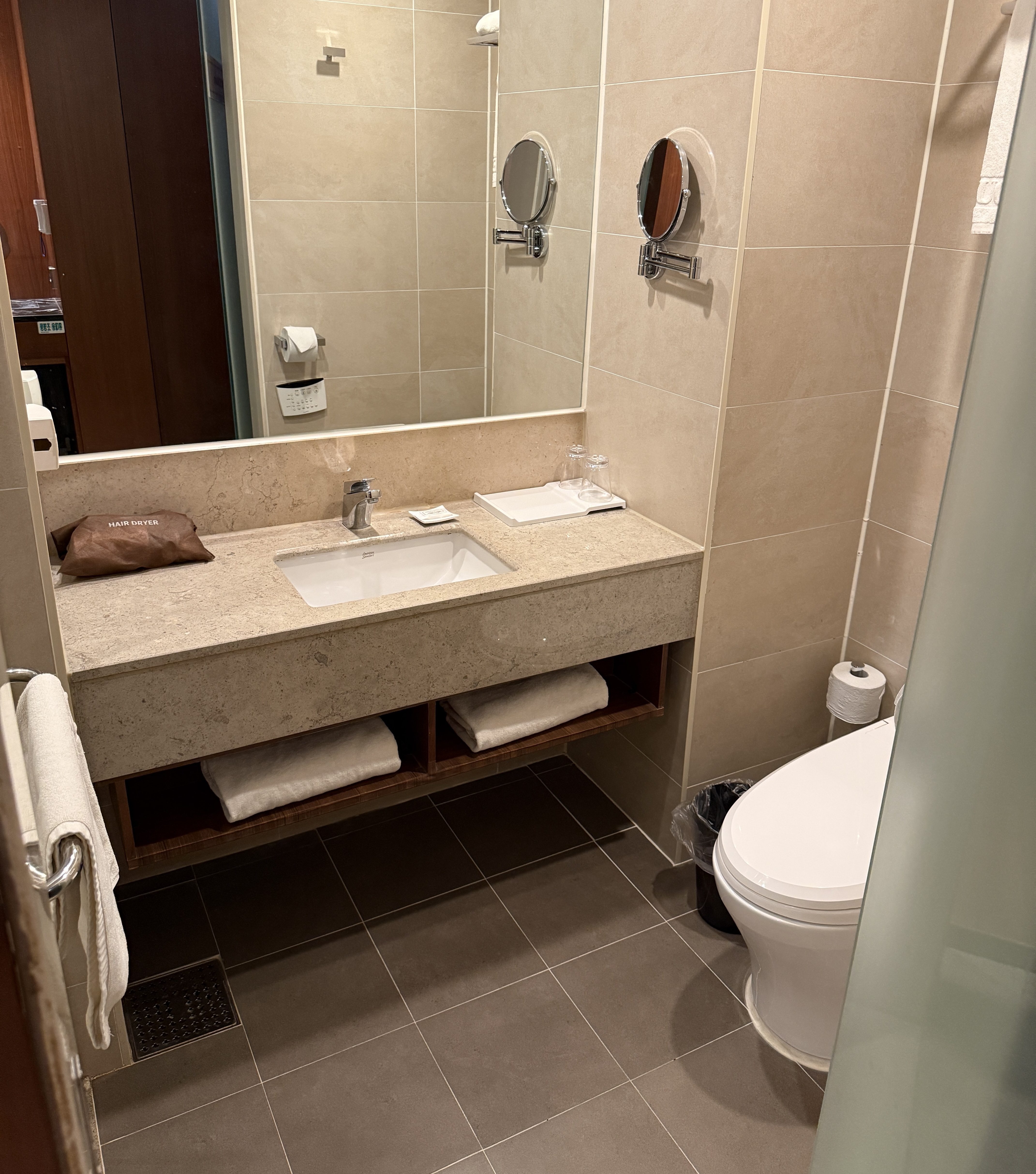 패밀리 트윈룸의 또 다른 장점은 바로 욕실이었다. 넉넉한 사이즈의 샤워부스가 따로 마련되어 있었고, 수압도 좋아서 여행의 피로를 말끔히 씻어낼 수 있었다. 어메니티는 기본적인 구성 외에도 샴푸, 컨디셔너, 바디워시가 따로 분리되어 제공돼서 사용감이 좋았다. 헤어드라이어도 고장 없이 잘 작동했고, 슬리퍼와 추가 수건도 요청하면 바로 가져다주는 응대가 인상 깊었다.